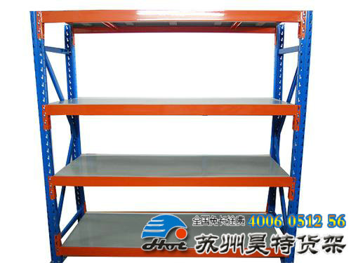 (2)中型搁板式货架,单元货架每层载重量一般在 200~ 800 kg 之间,总承载一般不大于 5000kg 。单元货架跨度通常不大于 2.5m ,深度不大于 1m ,高度一般在 3m 以内。如果单元货架跨度在 2m 以内,层载在 500kg 以内,通常选无梁式中型搁板式货架较为适宜;如果单元货架跨度在 2m 以上,则一般只能选有梁式中型搁板式货架。无梁式中型货架与有梁式中型货架相比,层间距可调余地更大,更稳固、漂亮,与环境的协调性更好,更适于一些洁净度要求较高的仓库;有梁式中型搁板式货架则工业化特点强一些,较适用于存放金属结构产品。中型搁板式货架应用广泛,适用于各行各业。